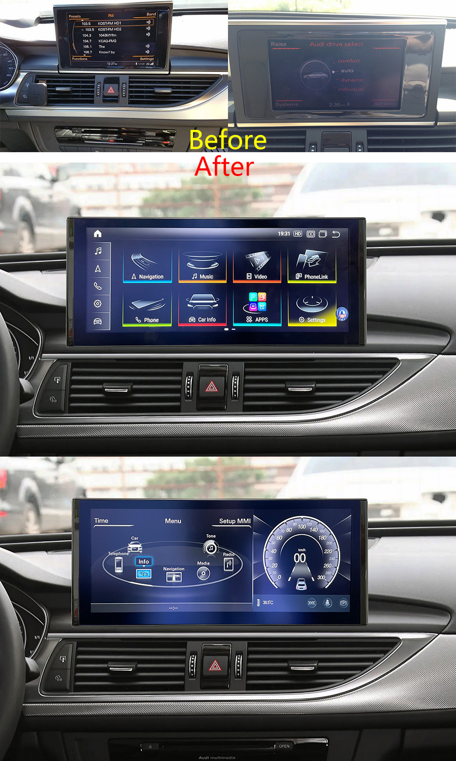 1. Note the screen is fixed. It does not flip down as the original Audi A3/A6/A8 display screen.