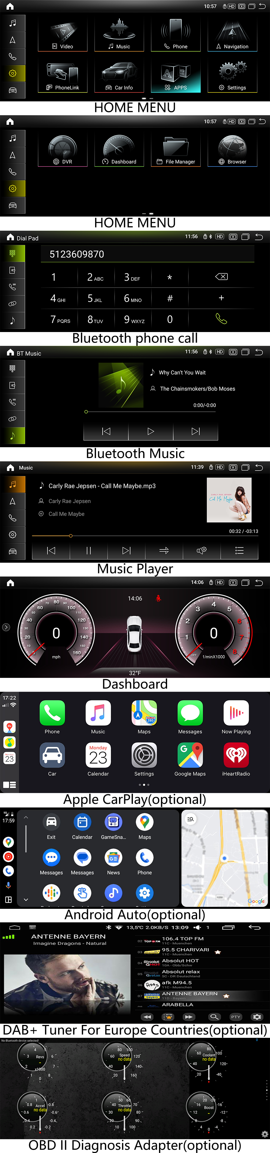 With the same wiring and connector as the original radio, installation is as simple as plug-and-play. Once installed, you'll have a smart entertainment system with touch screen/navigation/FM/AM/USB/Wi-Fi/AUX-IN/Bluetooth phone/Bluetooth music//rearview camera/Apple CarPlay/Android Auto/TV (tuner optional)/OBD (device optional)/Google Play, and more.