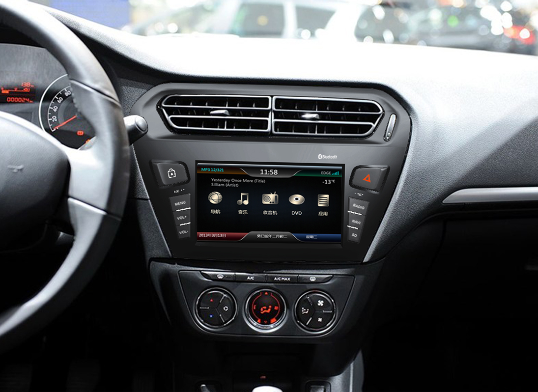 Peugeot 301 2012 Aftermarket Navigation DVD Player Head Unit has a 7 inch 16:9 TFT LCD monitor digital panel. It can support original steering wheel controls.