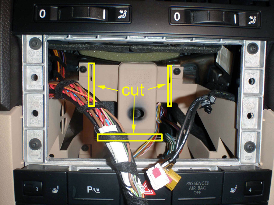 Answer: Please cut the plastic parts as shown in below photo. Then there will be enough room behind the radio allows you to clear up the harness. These plastic are unused, you can even restore the factory radio after they are cut.