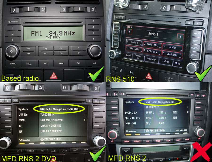 1. This product is compatible with VW Touareg 2003-2010 with based radio, RNS 510 and MFD RNS 2 DVD head unit. It is NOT compatible with MFD RNS 2 radio.